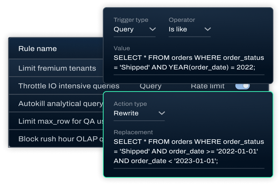 Maximize speed and prevent issues by creating customized rules that set rate limits, protect production data, rewrite problematic queries, and more.